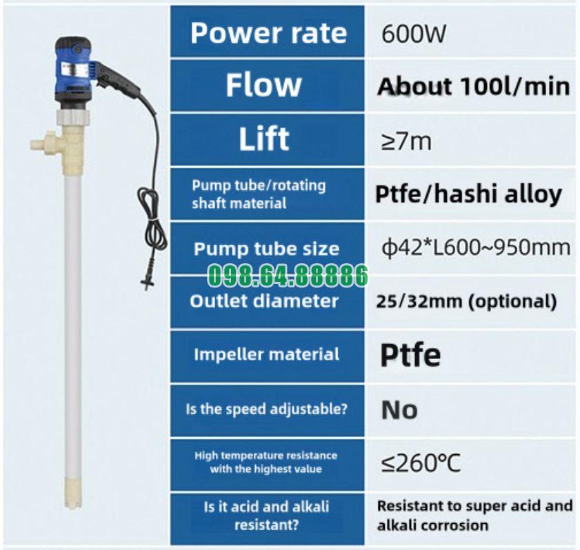 Bơm chiết rút hóa chất JDT-600W từ phuy 20–200L, vật liệu PTFE
