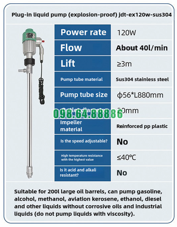 Bơm chất lỏng cắm điện chống cháy nổ JDT-EX120W-SUS304 được thiết kế để sử dụng trong môi trường dễ cháy như xăng, dầu, ethanol hay methanol. Nguyên lý vận hành ổn định, không tạo tia lửa điện giúp đảm bảo an toàn trong suốt quá trình sử dụng.