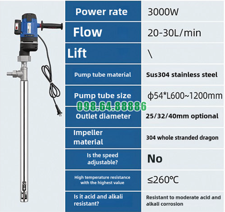 Tại sao nên chọn Bơm điện trục cong hút phuy JDT-3000W-JLG260 nằm ở thiết kế trục cong chuyên dụng, công suất mạnh mẽ, khả năng chịu nhiệt cao và vật liệu inox bền bỉ. Đây là giải pháp phù hợp cho doanh nghiệp cần bơm chất lỏng từ thùng phuy một cách ổn định, an toàn và hiệu quả trong môi trường công nghiệp.