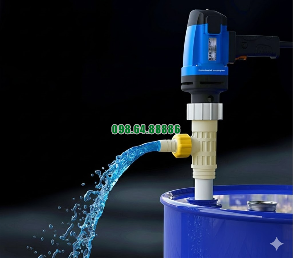 Thiết kế này giúp quá trình sang chiết diễn ra nhanh và gọn gàng. Người vận hành chỉ cần đặt ống bơm vào thùng phuy và khởi động máy, dung dịch sẽ được hút lên liên tục cho đến khi gần cạn.