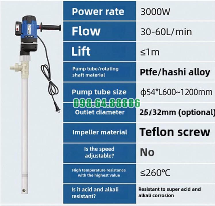 Thông số Bơm trục vít cầm tay hút thùng phuy JDT-3000W-PTFELG