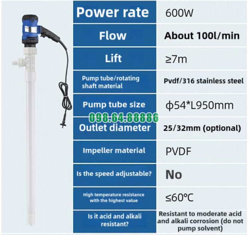 JDT-600W-PVDF là một trong những dòng máy bơm thùng phuy có thiết kế tối ưu nhất hiện nay, kết hợp hoàn hảo giữa hiệu suất, độ bền và tính tiện dụng.