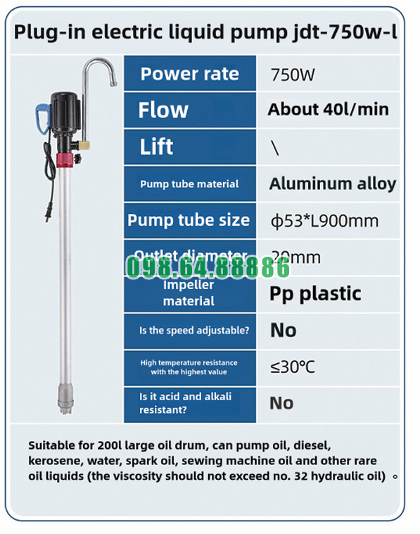 Khi cánh bơm quay liên tục, chất lỏng bắt đầu được hút từ bên trong thùng đi qua thân bơm. Chu trình làm việc lý tưởng của Máy bơm điện hút thùng phuy vỏ nhôm JDT-750W-L chỉ đạt được khi chất lỏng có độ nhớt không vượt quá dầu thủy lực số 32. Các chất lỏng phù hợp gồm dầu, diesel, dầu hỏa, dầu máy may, dầu đánh lửa, nước và các loại chất lỏng dạng dầu tương đương.