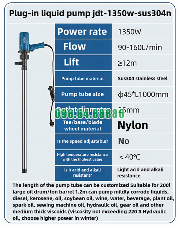 Máy bơm hút thùng phuy cắm điện JDT-1350W-SUS304N là một thiết bị được thiết kế đặc biệt để bơm các loại chất lỏng có độ nhớt trung bình. Với công suất 1350W, lưu lượng bơm từ 90-160L/phút và khả năng chịu được các chất lỏng có tính ăn mòn nhẹ như dầu diesel, dầu hỏa, và dầu mỡ, máy bơm này có rất nhiều ứng dụng trong ngành xăng dầu. Dưới đây là những ứng dụng chủ yếu của máy bơm này trong lĩnh vực xăng dầu.