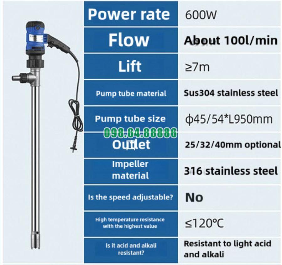 Bơm hút thùng phuy chịu nhiệt JDT-G120-600W được trang bị motor điện công suất 600W, tạo ra lực quay mạnh và ổn định trong quá trình vận hành. Công suất này cho phép máy xử lý tốt cả các chất lỏng có độ nhớt trung bình – cao, đặc biệt trong điều kiện nhiệt độ tăng.