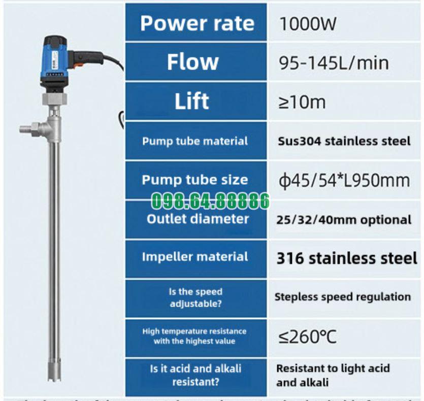 Nhờ nguyên lý ly tâm tiên tiến, vật liệu inox bền bỉ và cơ chế truyền động trực tiếp, Máy bơm thùng phuy inox JDT-1000W-G260 mang lại hiệu suất bơm chất lỏng tối ưu, ổn định và tiết kiệm năng lượng. Đây là lựa chọn lý tưởng cho các ngành công nghiệp hóa chất, thực phẩm, dung môi và xử lý chất lỏng đặc biệt