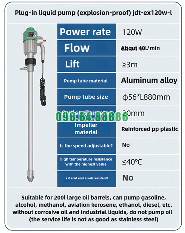 Máy bơm chất lỏng cắm trực tiếp chống cháy nổ JDT-EX120W-L hoạt động hiệu quả với các dung môi như: